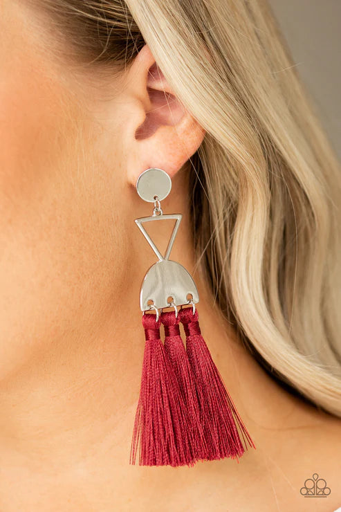 A shimmery silver disc, airy silver triangle, and shimmery half moon frame link into a geometric lure. Three red threaded tassels swing from the bottom of the stacked frame for a trendy finish.