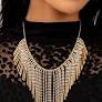 Seemingly separated by dainty gold beads, shimmery strands of white rhinestones majestically morph into gold rectangular frames along a sleek rounded snake chain. The glamorously golden getup stacks into timelessly tapered tassels, creating a flauntable fringe below the collar. Features an adjustable clasp closure.