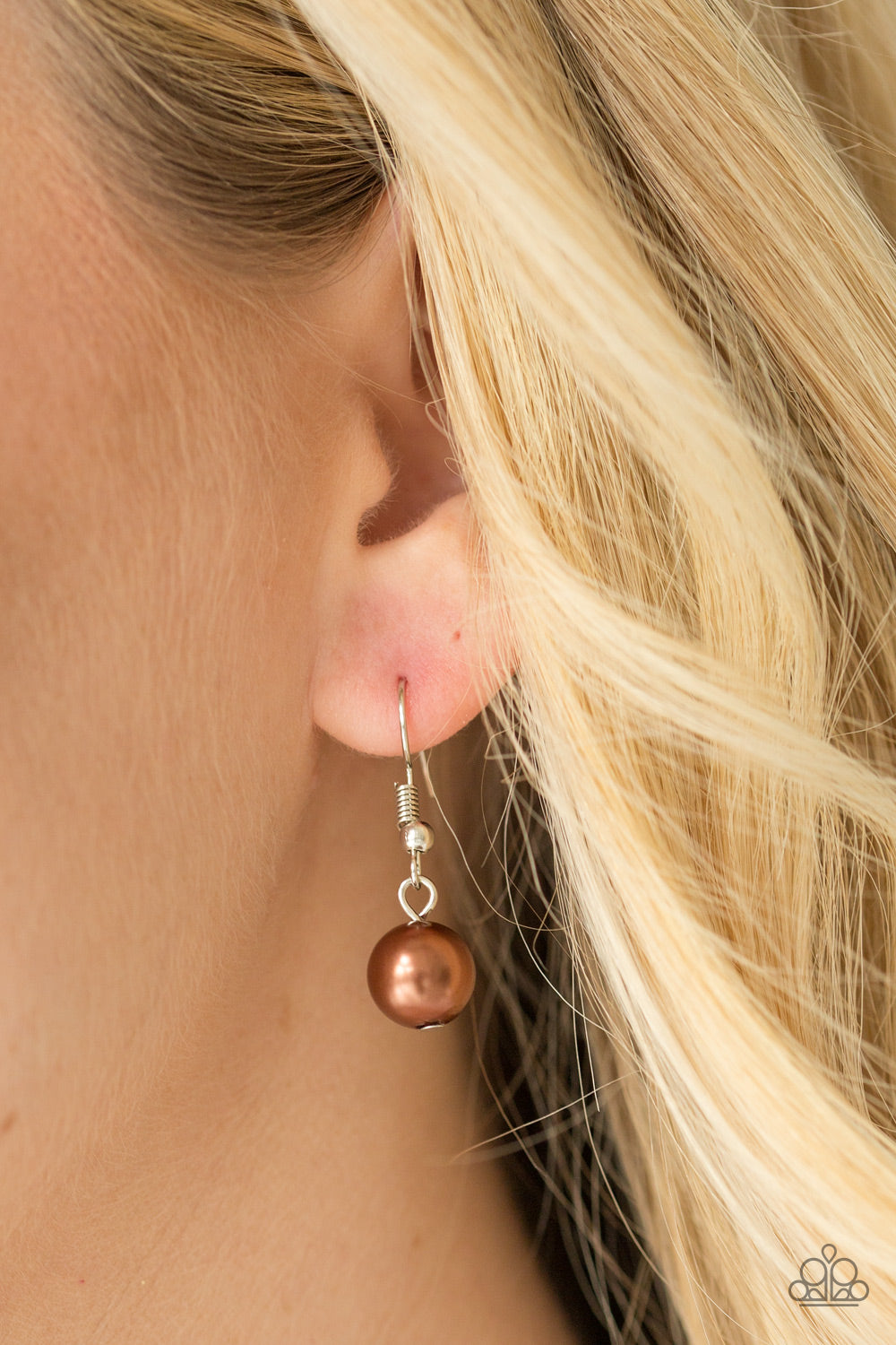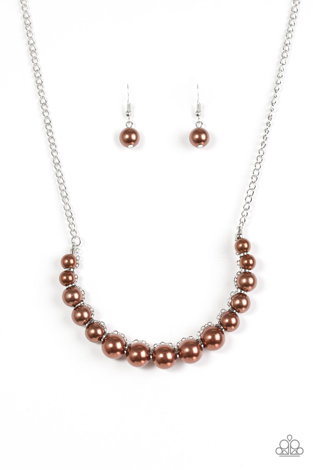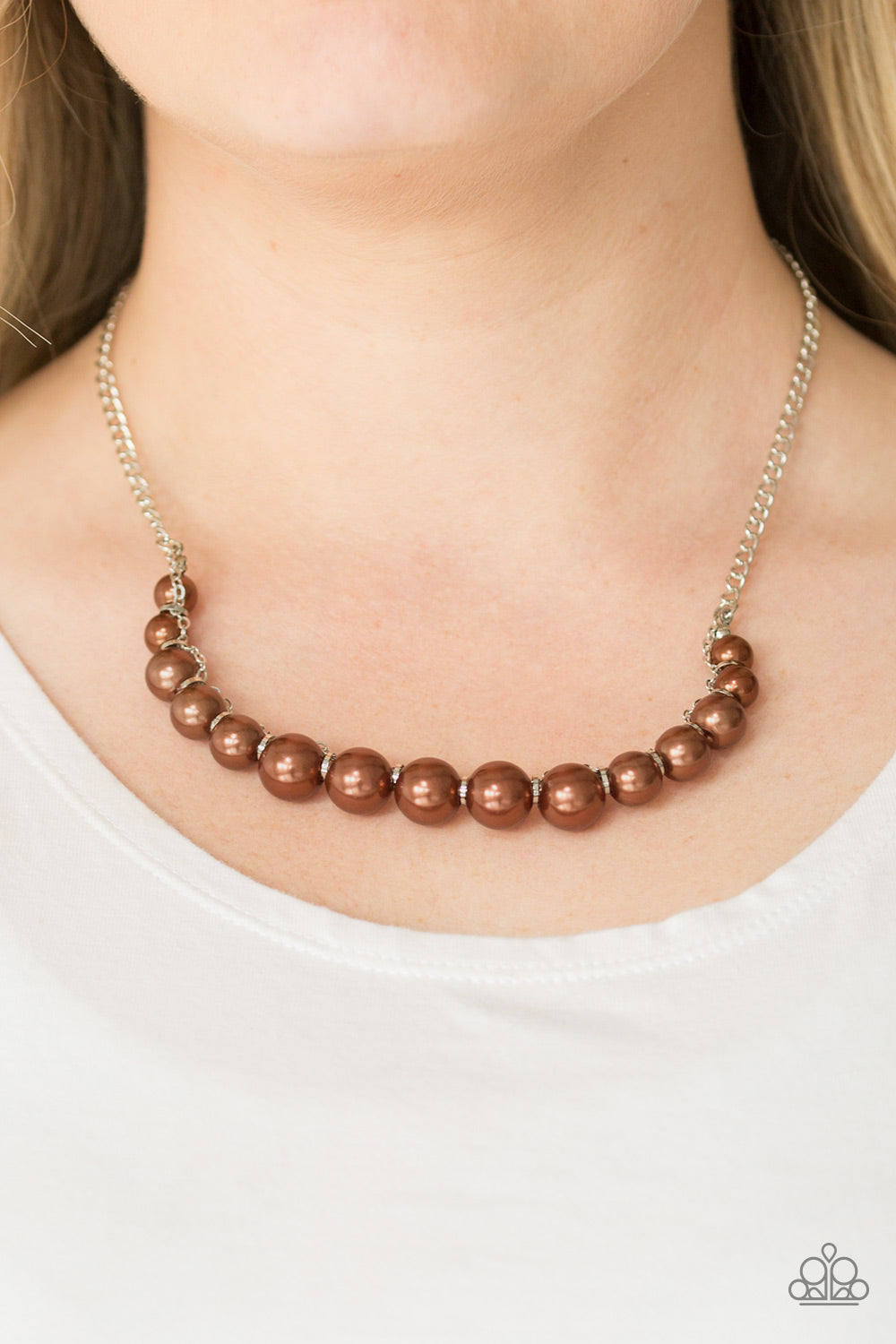 A classic strand of brown pearls is threaded along an invisible string, creating a stationary pendant below the collar. Infused with shimmery silver accents, silver chain weaves atop the pearls for a refined finish. Features an adjustable clasp closure.