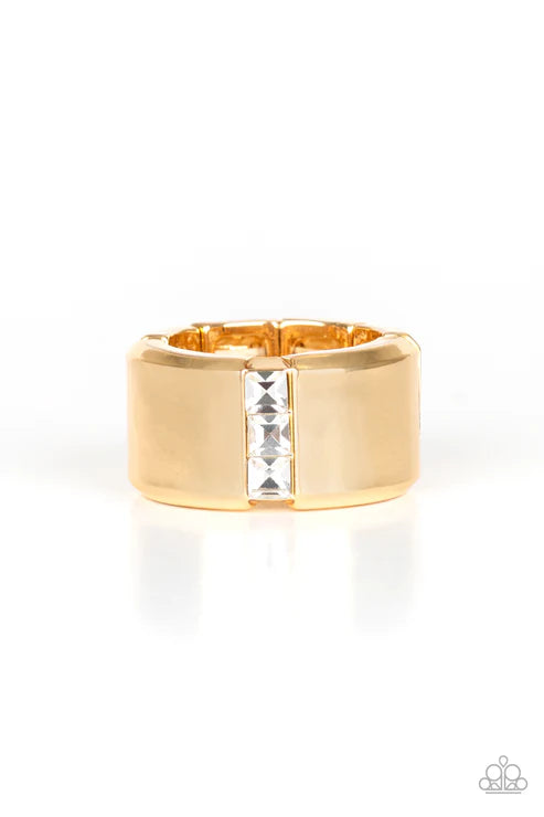 A single row of square-cut white rhinestones stack down the center of a thick gold band. Features a stretchy band for a flexible fit.