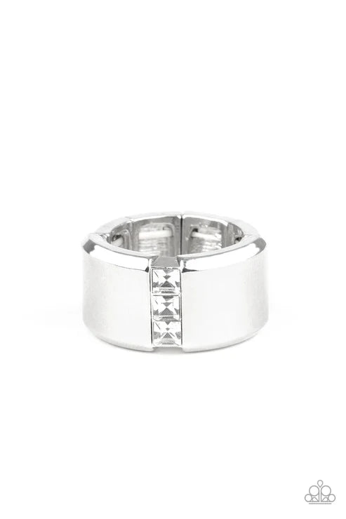 A single row of square-cut white rhinestones stack down the center of a thick silver band. Features a stretchy band for a flexible fit.