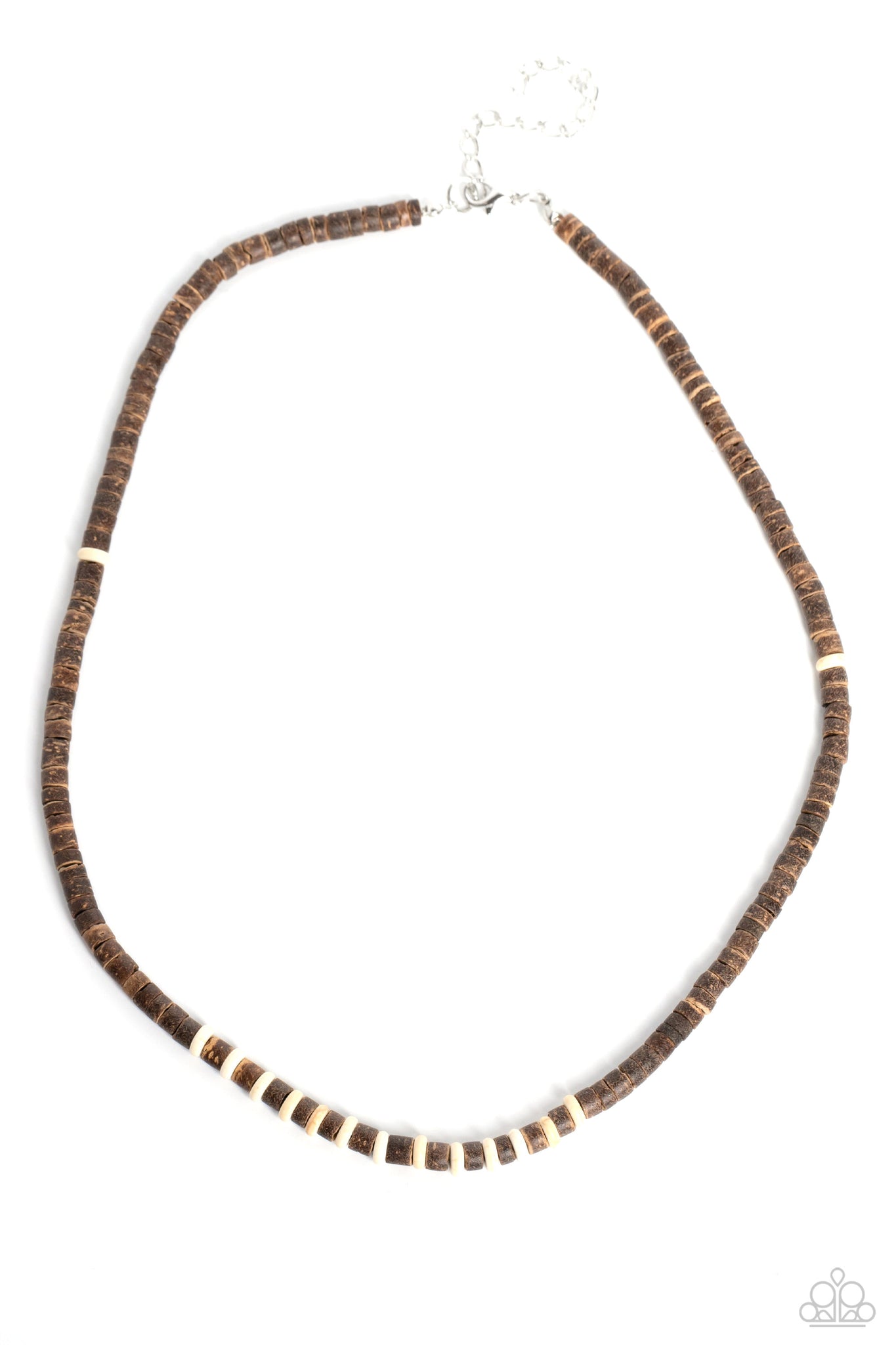 Threaded along an invisible wire, brown wooden beads and white stone discs haphazardly coalesce down the neckline for an earthy finish. Features an adjustable clasp closure. As the stone elements in this piece are natural, some color variation is normal.