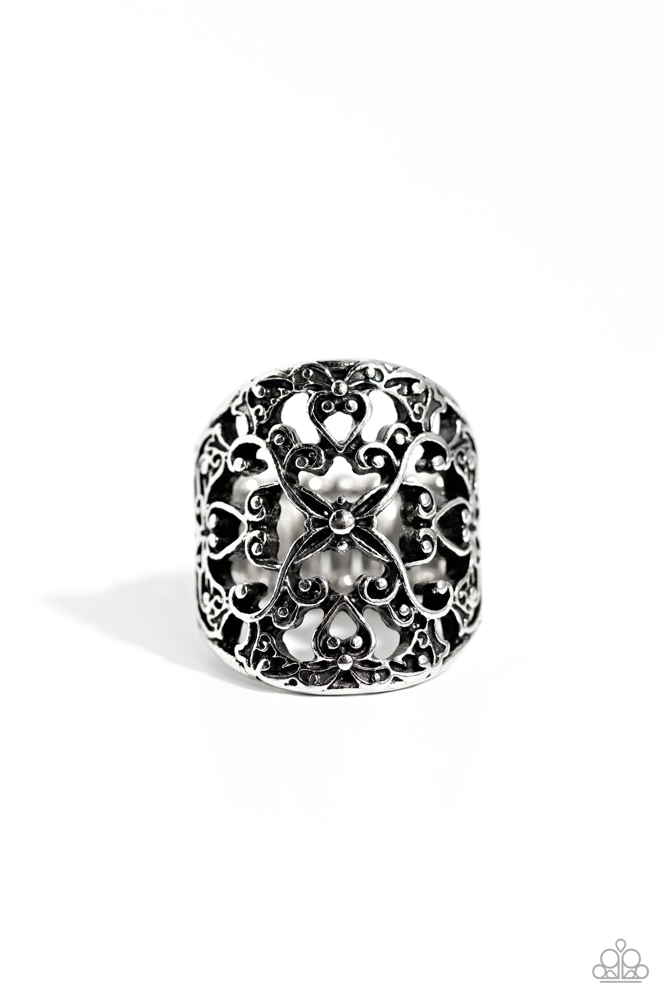 A band of airy silver curls around the finger, creating a whimsical centerpiece. Brushed in a high-sheen shimmer, frilly heart filigree climbs inside the frame for a vintage finish. Features a stretchy band for a flexible fit.