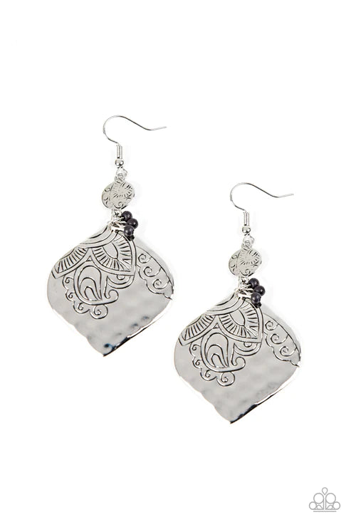 A dainty silver disc and hammered teardrop frame are stamped in a tropical floral pattern as they link into a shimmery lure. A cluster of dainty black beads is added to the whimsical display, invoking a pop of seasonal color. Earring attaches to a standard fishhook fitting.