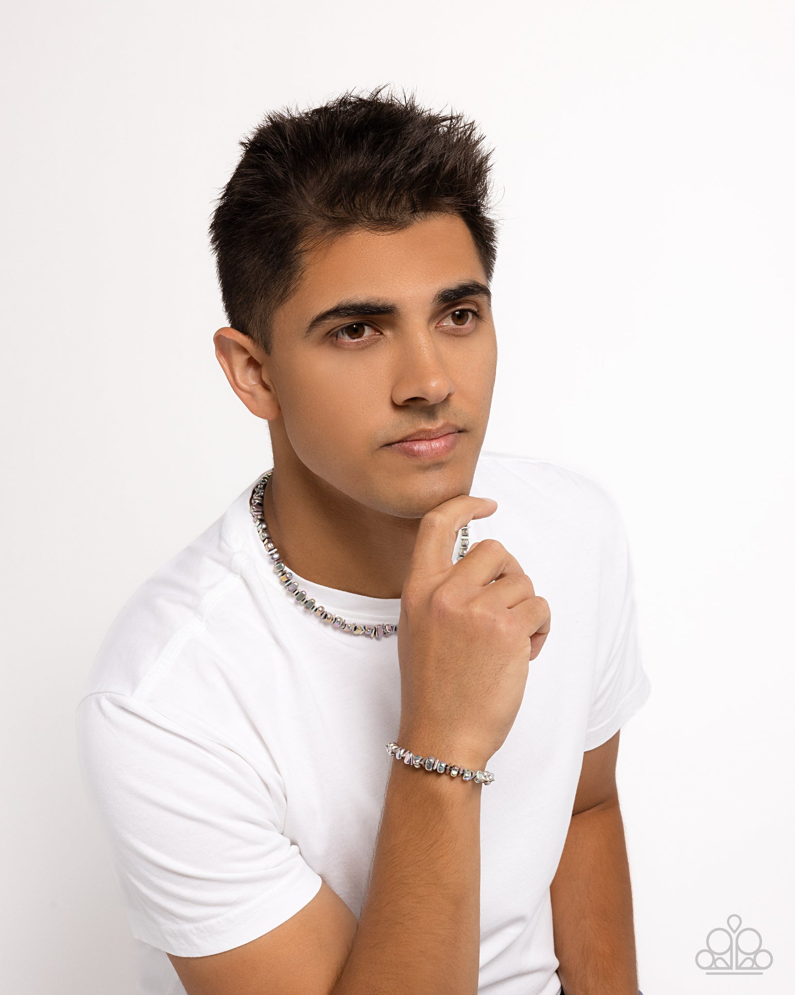 Infused along an invisible string, a collection of pink iridescent-brushed pebbles alternates with oil spill chiseled beads for a uniquely urban statement. Features an adjustable clasp closure. Due to its prismatic palette, color may vary.