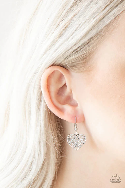 Brushed in an antiqued finish, silver filigree climbs a heart-shaped frame, creating a vintage inspired pendant below the collar. Features a toggle closure.