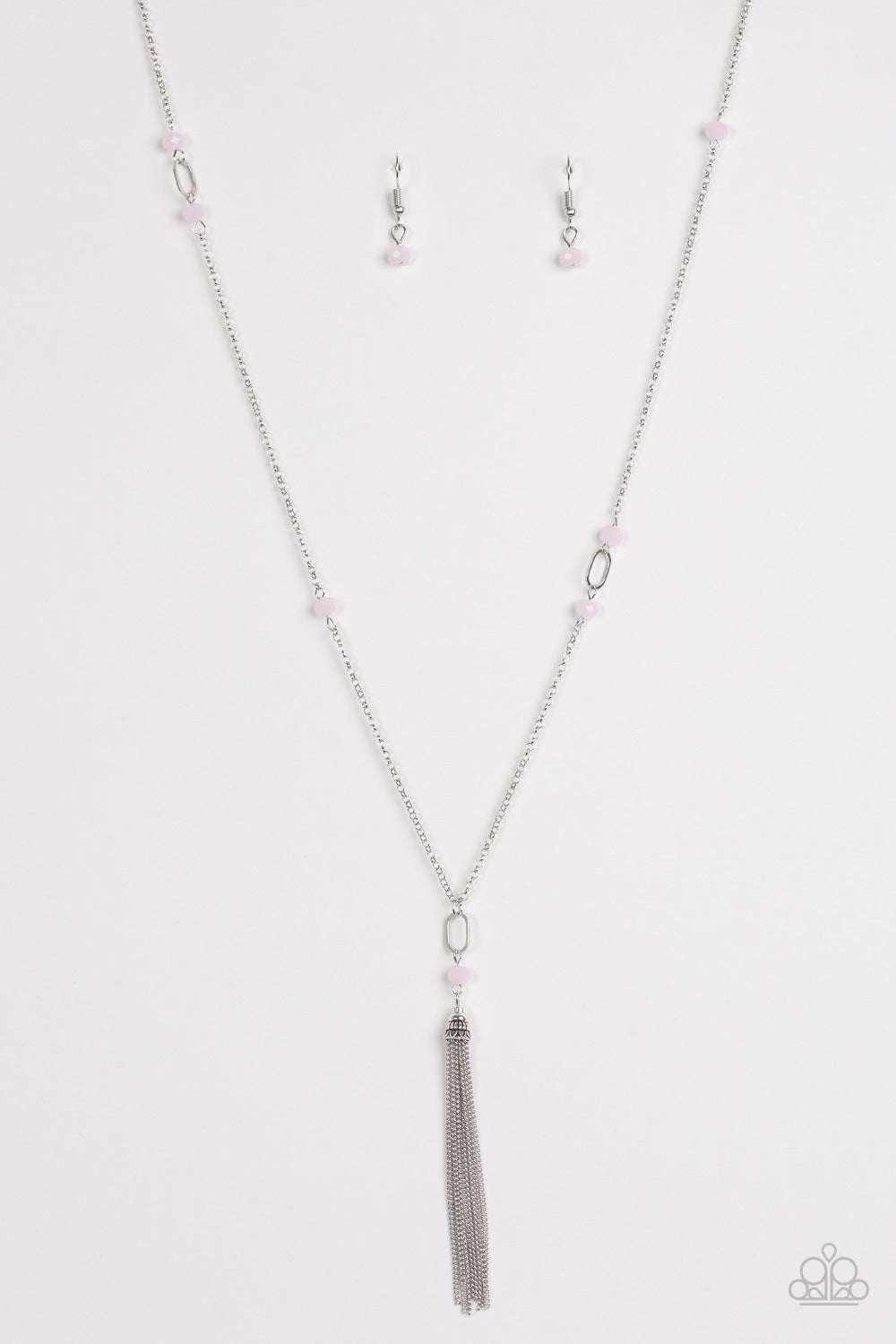 Dainty pink opaque beads and shimmery silver accents are sprinkled along an elongated silver chain. A shimmery silver tassel swings from the bottom, adding a wanderlust finish to the whimsical palette. Features an adjustable clasp closure.