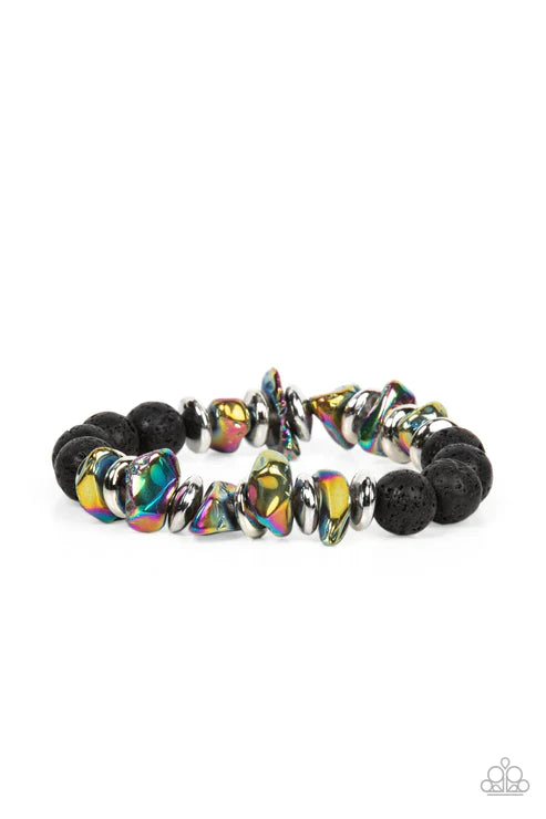 An earthy collection of black lava rock beads, dainty silver discs, and oil spill metallic pebbles are threaded along a stretchy band around the wrist, resulting in an edgy look.