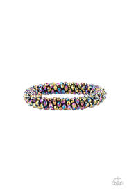 Sparkling with dramatic brilliance, a collection of faceted dainty oil spill beads are threaded along a woven stretchy band creating a stunning statement around the wrist.