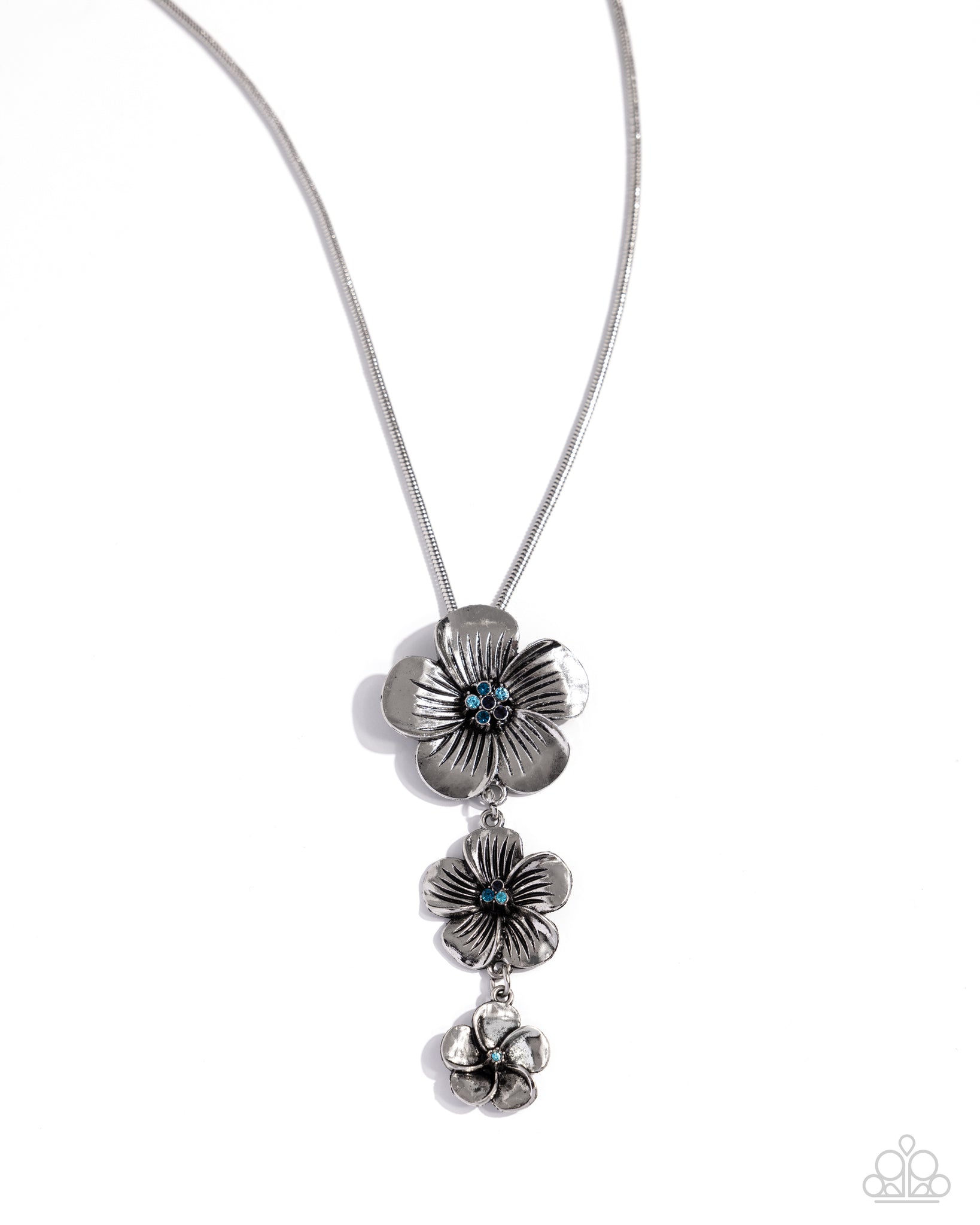 Featuring a mismatched display of blue multicolored rhinestones, three textured silver flowers link and decrease in size at the bottom of a silver snake chain, creating a whimsical display down the chest. Features an adjustable clasp closure.