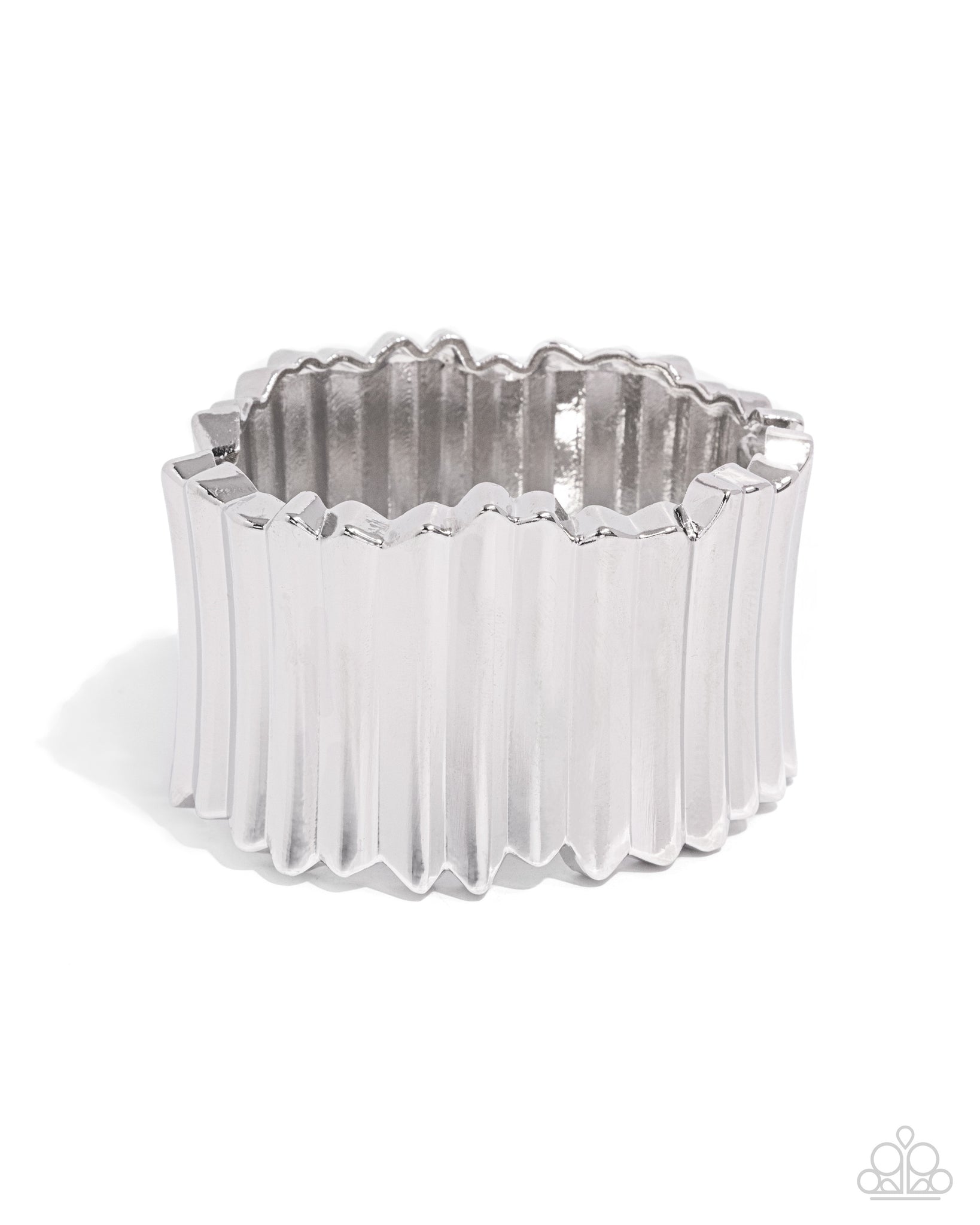 Featuring tactile linear texture, uneven silver bars are shorn in various places along the wrist for an edgy high-sheen cuff. Features a hinged closure.