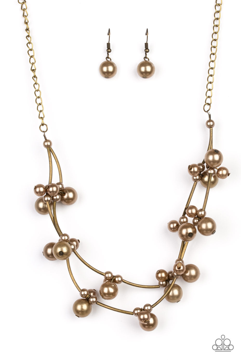 Cylindrical brass beads and clusters of pearly brass beads are threaded along invisible wires, creating bubbly layers below the collar for a refined look. Features an adjustable clasp closure.