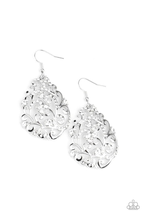 Dotted in an array of glittery white rhinestones, shiny silver filigree climbs the ear, coalescing into a vine-like teardrop frame. Earring attaches to a standard fishhook fitting.