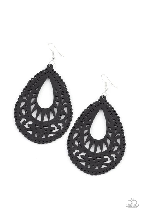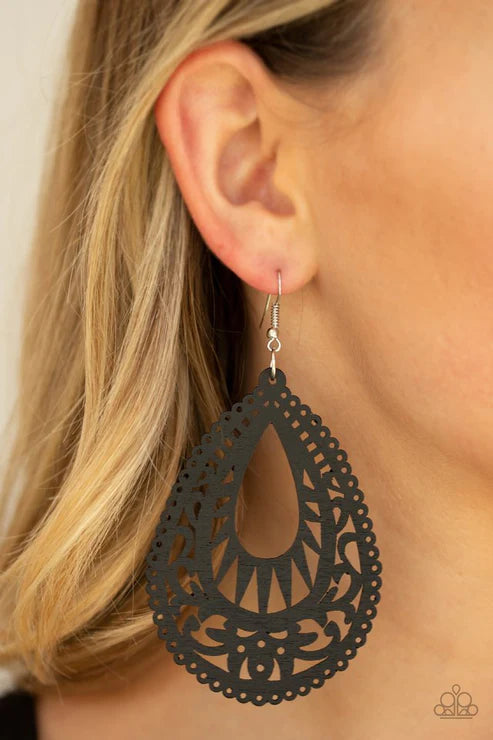 Painted in a black finish, an airy wooden frame swirling with filigree detail swings from the ear for a seasonal look. Earring attaches to a standard fishhook fitting.
